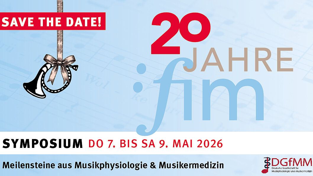 Im akademischen Jahr 2025-2026 feiert das Freiburger Institut für Musikermedizin (FIM) sein zwanzigjähriges Bestehen. Das feiern wir vom Donnerstag, 7. Mai bis Samstag, 9. Mai 2026 an der Hochschule für Musik Freiburg im Rahmen des 24. Symposiums der Deutschen Gesellschaft für Musikphysiologie & Musikermedizin (DGfMM). Hierzu laden wir Sie herzlich ein! Bitte reservieren Sie die Tage schon jetzt in Ihrem Jahreskalender 2026.
