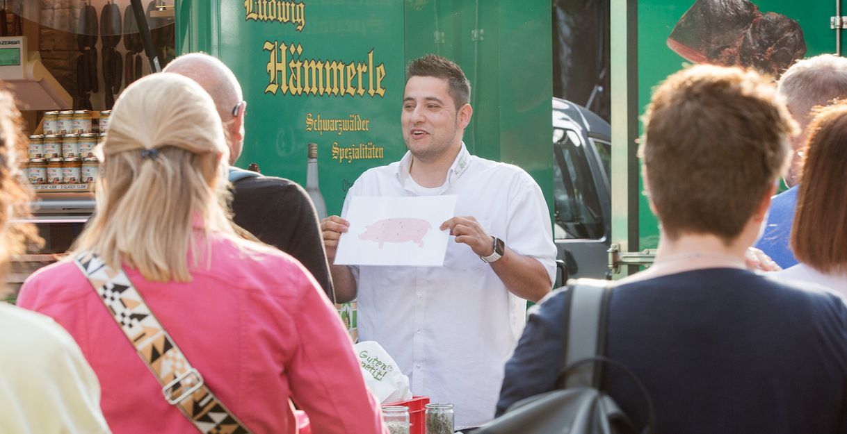 Drei Stunden geführte Markttour mit Wissen, Geschichten und viel Genuss. Verkostet wird direkt bei den Erzeuger:innen - Käse, Schinken, Brot, Münsterwurst, Kaffee, Wein, Alkoholfreies und weitere Probiererle vom Markt (vegetarische Variante buchbar).