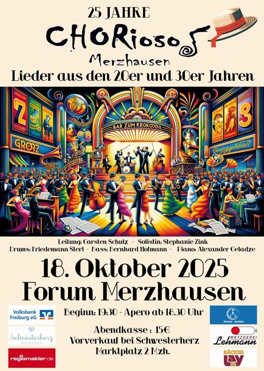 Zum 25-jährigen Jubiläum singt CHORioso bekannte und weniger bekannte Lieder aus den 20er und 30 Jahren. Unterstützt wird der Chor von der Solistin Stephanie Zink und der Band (Friedemann Stert, Drums; Bernhard Hofmann, Bass; Alexander Geladze, Piano).